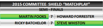 Current Committee Shield champion Howard has made it through to the Semi finals where he takes on new member Martin for a place in the final. The other semi sees a previous double champion Steve looking to get through to the final for a 3rd time against Ricky who himself is a previous beaten finalist. All to play for so they are out last, they can take as much time as they like to plot their victory. |