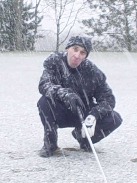 in full swing on the par 3 12th. This swing in the driving snow won him